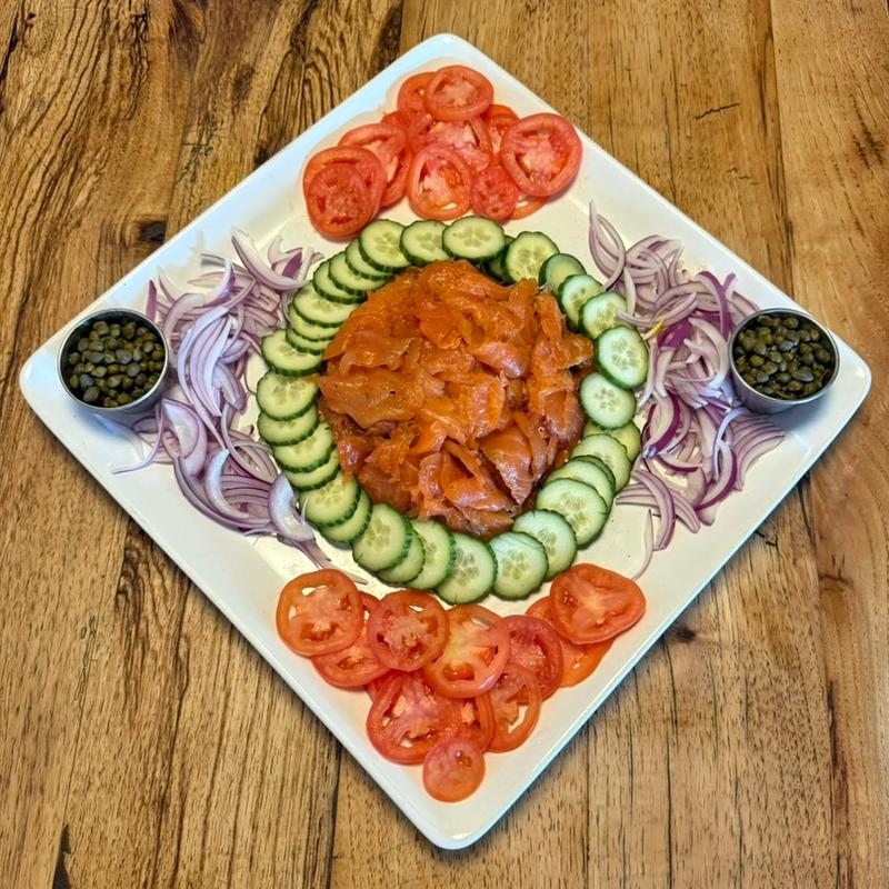 Togarashi lox (1lb),1/2 dozen assorted bagels, pint of cream cheese, cucumber, red onion, tomato, and capers