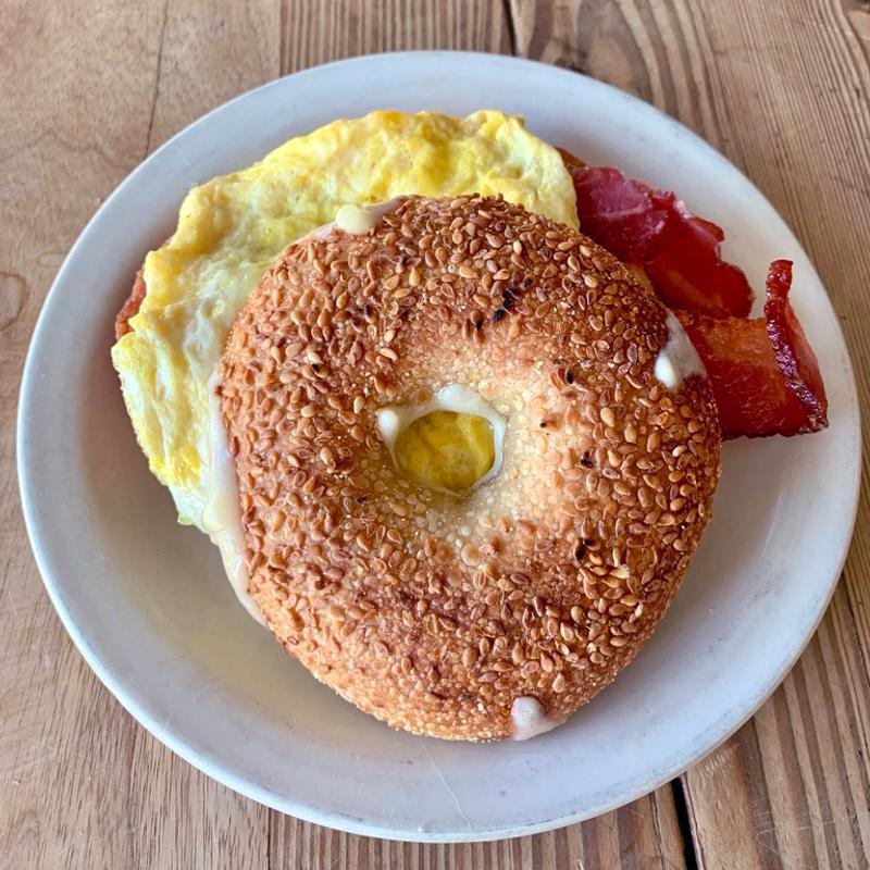 Scrambled egg*, bacon, white cheddar cheese, your choice of bagel