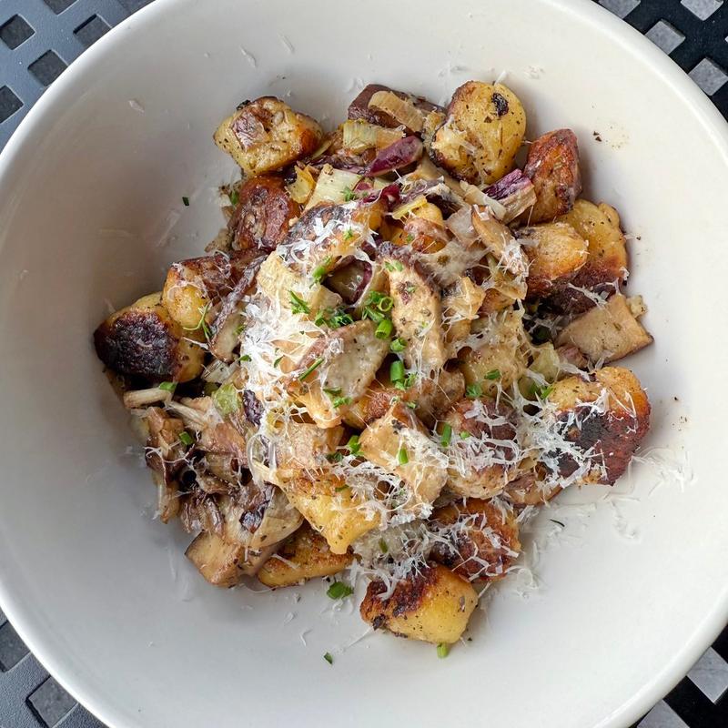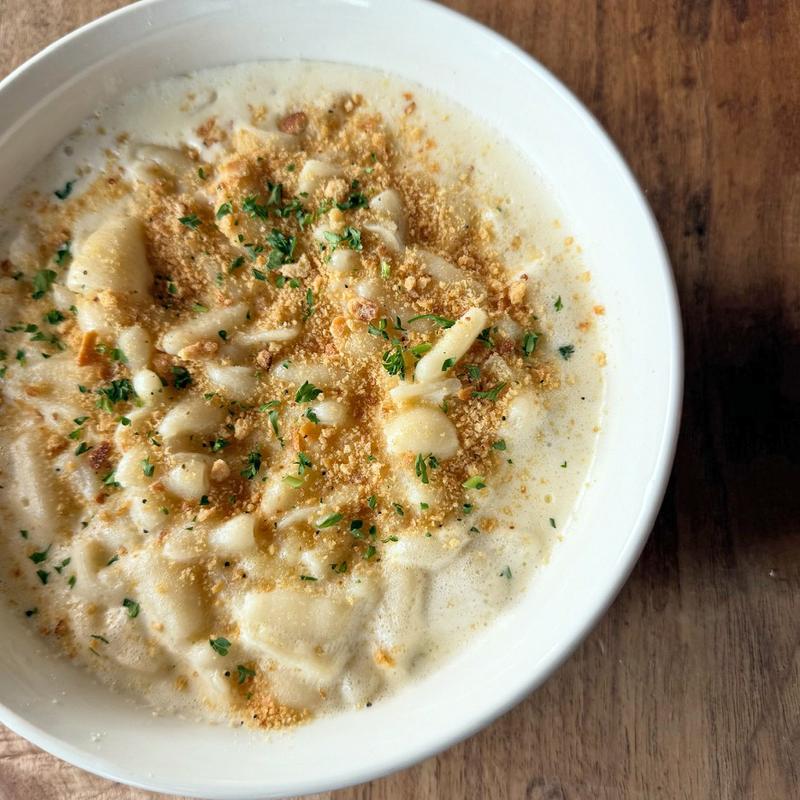 Truffle oil, gouda, cream, bagel crumbs. Add smoked chicken +$3