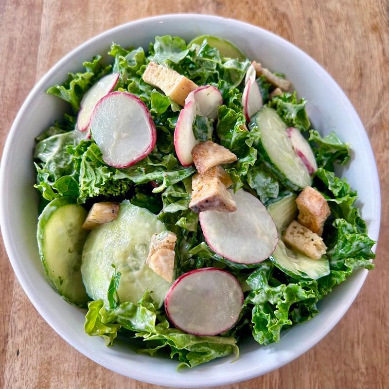 Kale, radish, cucumber, bagel croutons, vegan green goddess dressing