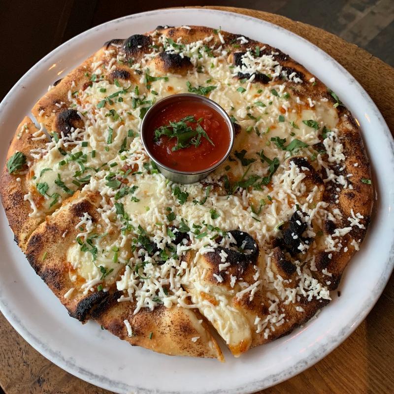 Flatbread with Wisconsin cheese curds, queso fresco, garlic butter, chives, side of marinara