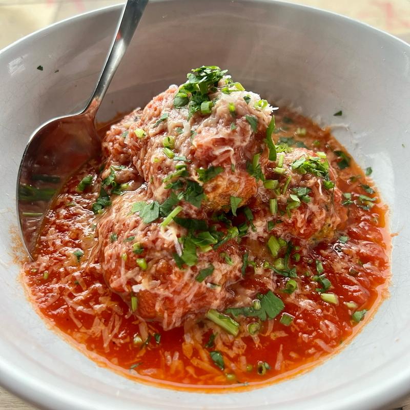 Housmade spicy pork meatballs, provolone, garlic butter, baguette, side of giardianara